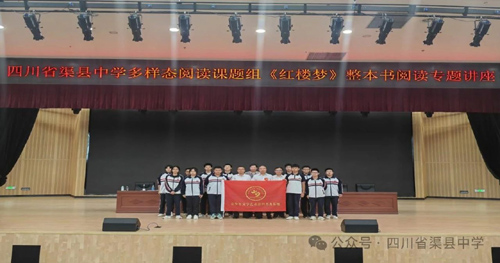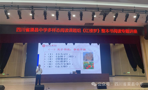 为顺应新高考改革趋势,促进文学艺术社科普及进校园、推动《红楼梦》整本书阅读教学研究,四川省青少年文学艺术社科普及进校园暨渠县中学多样态阅读课题组专题讲座于6月21日在渠县中学新校区图文馆隆重举行。四川省青少年文学艺术社科普及基地主任赵定贵、基地特聘专家张琪、基地专家姚春、渠县中学党委书记曹阳、副校长王松柏出席活动,渠县中学党委专职副书记汪震主持活动。活动中,曹阳、赵定贵分别致辞,张琪、姚春作《红楼梦》专题讲座,渠县中学近700名师生参加活动。