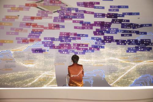 在“地瓜经济沉浸空间”里,一道道投影落在立体环绕的银幕前,只要踩上投影,银幕里的“地瓜脉络”上便开出一朵朵五片花瓣的“地瓜花”。陈列馆相关负责人介绍,“地瓜花”是根据他们收集整理的在外乐商信息,统计与之相关的企业及行业数据,利用信息可视化技术描绘出的具现化形象。其中,每朵花代表乐商在一个城市的投资经营情况,每片花瓣代表乐商企业所在的行业,花瓣大小则表示该行业企业的数量和投资体量。