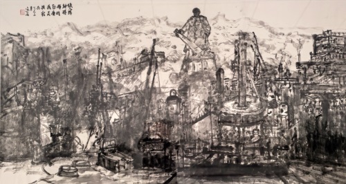 大庆精神与铁人精神主题作品,则以工业意象打破传统水墨语境。井架以焦墨写就,线条如钢筋铁骨刺破云天,石油工人挥臂的动态融入蒸腾墨雾,刚健笔触与氤氲水汽碰撞出“有条件要上,没有条件创造条件也要上”的豪迈;北大荒题材中,万亩良田以淡墨铺陈如金色麦浪,垦荒者挥鞭的弧线似音符跃动,没骨法与写意笔调交织出“把荒原变粮仓”的拓荒史诗。