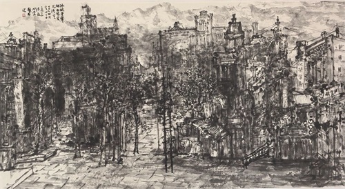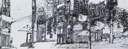 《冰城芳华》系列聚焦哈尔滨欧陆风情与巴洛克古建,以水墨为“时光滤镜”,解码城市的“混血”基因。中央大街马迭尔宾馆的穹顶,在赭石与藤黄的暖调中流转百年光阴,窗棂雕花以工笔细描,叶脉般的纹路里藏着俄式建筑的精致;老道外“中华巴洛克”建筑群,以浓墨勾勒砖雕轮廓,淡墨晕染墙面斑驳,似能触摸到岁月侵蚀的痕迹。圣索菲亚大教堂雪景图中,飞檐与洋葱头穹顶的线条被雪色柔化,水墨留白营造出“千树万树梨花开”的意境,东方含蓄与西方典雅在宣纸上完成跨时空对话。