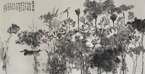 野生荷花系列尤为亮眼:荷叶以大写意泼墨,浓淡交织间尽显“接天莲叶无穷碧”的壮阔;荷花以白粉晕染花瓣,边缘略施曙红,于水墨苍劲中透出“出淤泥而不染”的清逸;茎秆穿插如琴弦,露珠点缀似音符,构建出寒地水塘的静谧交响。整组作品以花寄情,让墨香中弥漫着对黑土地“芳心向暖”的眷恋,如馨香远播,诉说故土的丰饶与温柔。