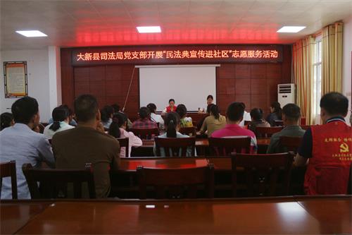 为深入践行司法为民宗旨,使党建与法治建设工作深度融合,营造尊法、学法、守法、用法新风尚。4月29日,大新县司法局党支部到新兴社区开展党员“双报到”暨“民法典宣传进社区”志愿服务活动。