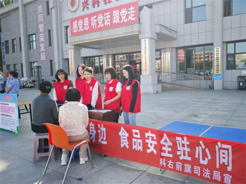 为深入贯彻落实《中华人民共和国食品安全法》,提升辖区居民食品安全意识和依法维权能力,2025年9月4日,科右前旗司法局与市场监督管理局、农科局、公安局等部门,联合开展2025年全国食品安全宣传周活动。 活动在科右前旗兴科社区门前举办,通过设置宣传台、法律咨询台、摆放宣传展板、悬挂宣传条幅等形式进行宣传。普法志愿者向群众发放了《中华人民共和国食品安全法》《中华人民共和国民法典》《2025年禁限用农药名录》等宣传手册200余册,法治手提袋、法治围裙等宣传用品200余件。 通过本次宣传,让居民真正了解到《中华人民共和国食品安全法》并非遥不可及,而是与自身每日的“米袋子、菜篮子、餐桌子”息息相关,进一步提升群众防范食品安全风险的意识。下一步,科右前旗司法局继续把食品安全普法宣传作为“八五”普法的一项重要内容,常态化开展相关活动,切实筑牢食品安全法治屏障,为保障辖区人民群众身体健康和生命安全贡献司法行政力量。