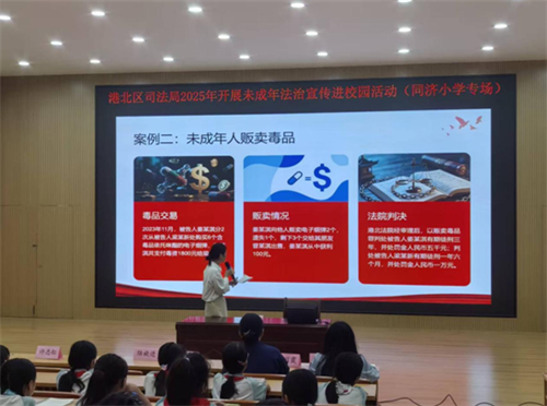青少年是祖国的未来,民族的希望,他们的健康成长离不开法律的护航。为进一步提高青少年法律意识,增强自我保护能力,做到遵纪守法,学会运用法律援助去维护自己的权益。2025年9月16日以来,港北区司法局分别到港北区八一小学、同济小学、三合小学、港北三中、港北四中五所学校开展法润护航助成长活动。 讲座上,法律援助律师结合自身经历讲事实、摆数据,让同学们在遇到不法侵害的时候,学会利用法律的武器维护自己的权益,增强未成年的法治意识,让法治能够深入社会、深入校园、深入每一个少年心中。现场参加活动的学生有4100余人,发放宣传资料《法律援助法》《宪法》《预防未成年人犯罪》《禁毒知识普及教育》《民法典》5000余份。
