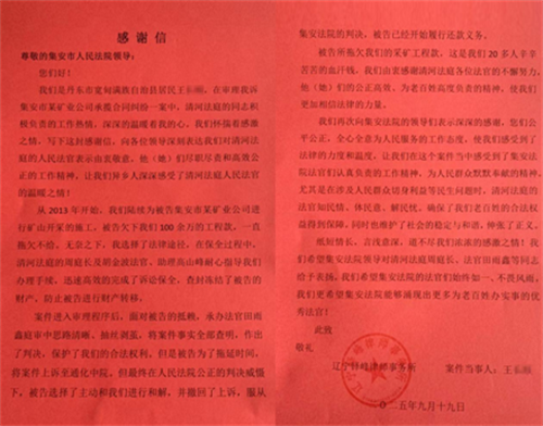 方寸信笺载真情,声声感谢映初心。近日,集安法院清河法庭收到了一封饱含深情的感谢信。信中,当事人以真挚的文字,讲述了自己作为异乡人,在法庭的帮助下成功追回拖欠十余年的百万工程款的经历,字里行间满是对法庭工作人员的感激与敬意,更折射出法庭在落实为民服务举措过程中,彰显的公平正义与司法温度。 被告拖欠当事人与20多名工友的100余万元“血汗钱”长达十余年之久,期间当事人多次索要无果,最终他选择法律维权。在诉讼保全阶段,法官干警细致指导、高效保全、及时查封冻结等多项举措,从源头上预防了被告转移财产的风险,让身处异乡的当事人第一次感受到了法律带来的安全感。案件审理中,面对被告抵赖辩解,承办法官细致梳理十余年的各项证据,逐一厘清案情与责任,最终依事实与法律作出公正判决,为当事人及20多名工友守住了合法权益。在被告上诉后,清河法庭法官仍然坚守公平正义,既积极配合中院审理,又耐心向被告释明法律后果。最终,被告认清上诉并无意义,主动与当事人和解、撤回上诉并履约还款,困扰当事人十余年的“心病”终于得以化解。