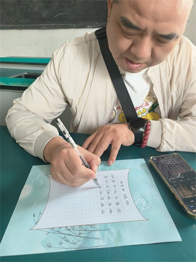 比赛现场,学生们姿势端正、神情专注,成为一道道动人的风景。低年级同学笔触虽显稚嫩,但书写工整、一笔一画尽显认真;中年级学生运笔逐渐稳健,字体架构大方匀称;高年级学生则笔法流畅,作品初具风骨韵味。教师们同样全情投入,以身示范,与学生同台挥毫,共同践行“提笔即练字”的务实理念。