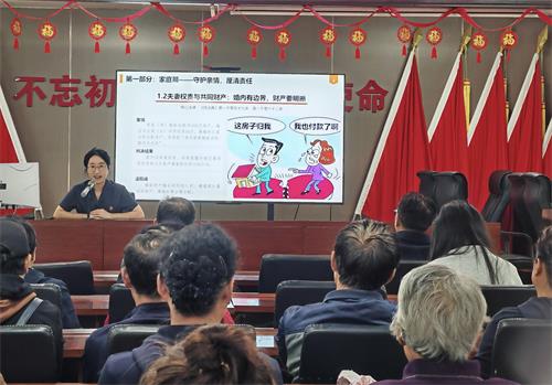 从“楼上漏水怎么赔”到“预付卡跑路咋维权”,再到“手写遗嘱为啥无效”,每个法律点都融入社区常见场景。讲到夫妻财产时,一位阿姨问:“我老伴婚前买房,我俩一起还贷,分开我能分钱吗?”干警用“100万房产共同还贷50万,最终补偿35万”的案例清晰解答,阿姨赶紧记在手机里:“这下有数了!”