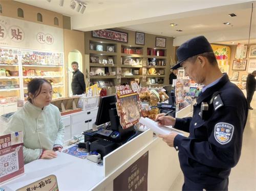 “阿姨,您店里的灭火器要放在显眼位置,记得每月检查一次压力值,遇到火情要先拔销子、再压手柄……”在文创店面内,民警手持灭火器现场演示操作方法,用通俗易懂的语言向经营者讲解消防安全知识。为提升场所负责人与工作人员的消防安全意识,一并结合近期全国典型火灾案例,以案说法提醒经营者杜绝麻痹思想,严格落实消防安全主体责任,确保“人人懂消防、会应急”。