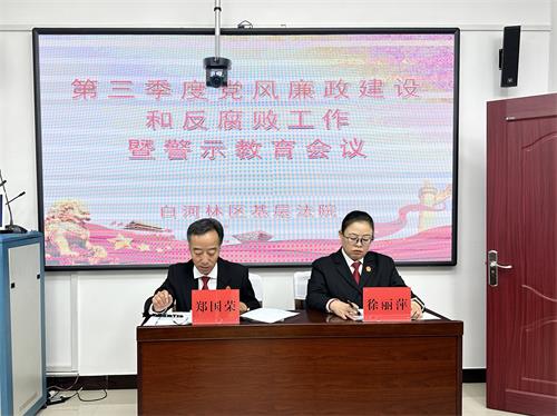 为深入推进全面从严治党,筑牢干警廉洁司法防线,10月16日,白河林区基层法院召开第三季度党风廉政建设和反腐败工作会议暨警示教育大会。会议由党组成员、副院长徐丽萍主持,党组书记、院长郑国荣出席并讲话,班子成员及全体干警参加会议。