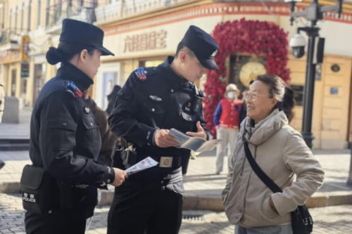 在广场、公园和景区景点,道里分局、松北分局组织民警开展流动宣传,将印有典型诈骗案例的手册和印着“不轻信、不转账”醒目标语的环保袋送到老人手中,用亲切叮嘱织密街头巷尾的“反诈防线”。