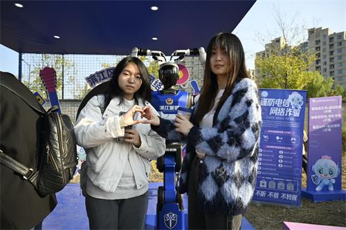 这个周末,华数“不止音乐节”的音浪席卷滨江。而在声浪之外,一股由滨江区公安分局掀起的“反诈新浪潮”同样引人注目——他们将反诈大转盘、街头互动和AI机器人天团直接搬进现场,打造了一个年轻人争相打卡的“反诈潮玩营地”。其中,能送礼物、会发传单的机器人与机器狗,成为了现场最受欢迎的“特殊警员”。