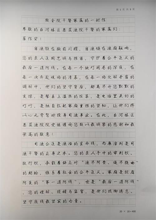 家风正则民风淳,民风淳则政风清。司法廉洁的防线,既要靠干警自身坚守,更离不开家庭的守护与助力。近日,白河林区基层法院向全体干警家属寄出了一封封廉洁信,以笔墨传廉意,用真情筑防线,一场跨越单位与家庭的“廉洁互动”温情上演。