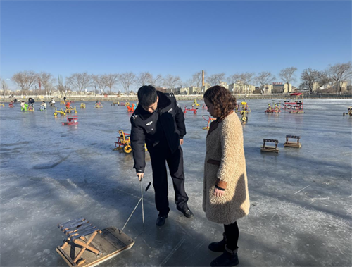 检查中,民警重点核查冰层厚度是否达标、防护围栏是否牢固、安全警示标识是否醒目、应急救援器材是否齐全有效,对冰面薄弱区域、消防设施等关键部位逐一排查,不放过任何安全隐患。与场地负责人面对面深入沟通时,民警既明确要求落实安全生产主体责任,完善应急预案、加强人员培训,更贴心叮嘱要重点做好未成年人管护和入场安全提示,把安全服务做到群众心坎上。