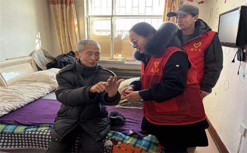 进屋后,志愿者们将物资妥善安置在厨房,还细心地为张大爷检查了燃气管道和电路开关,反复用手势和文字提醒他冬季用火用电安全。考虑到张大爷无法正常交流,铁人社区党支部书记提前准备了沟通卡片,上面写着“新春快乐”“有困难找社区”等字样,配合着温暖的眼神和简单的手势,与张大爷耐心“交谈”。看着满屋的新春物资和大家忙碌的身影,张大爷感动不已,不停地用手语比划着“谢谢”,眼角的皱纹里都洋溢着幸福的笑意。
