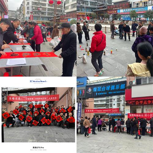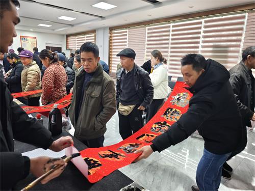 在新春佳节来临之际,为打造欢乐祥和的节日气氛,弘扬中华民族传统文化,把党的关怀送到工会职工群众手中去。2月9日,县总工会联合县书法家协会等单位在贯洞镇贵运社区开展“送万福·进万家”书法公益活动,活动现场引来近400余名群众前来参与,10名书法家挥毫泼墨,笔走龙蛇,妙笔生花,为现场群众送上一幅幅精美绝伦的春联好和福字。