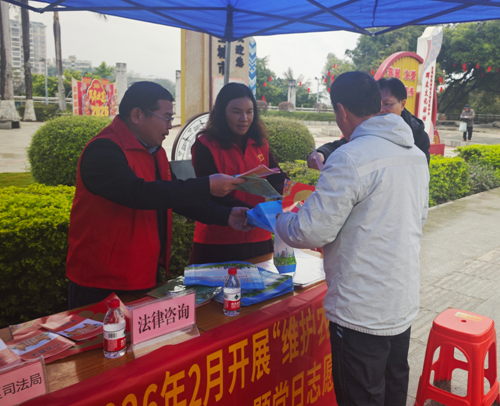 新春将至,年味渐浓。为切实提升社区居民法治素养,营造平安祥和、崇法向善的节日氛围,2月9日,江州区司法局在火车站广场、丽江广场开展春节前“送法进社区”主题宣传活动,将法治关怀与新春祝福一同送到群众身边。 活动现场,工作人员紧扣群众日常生活中的法律需求,用通俗易懂的语言解读《民法典》《行政复议法》《法律援助法》等与群众生活息息相关的法律法规,让专业法律知识变得易懂可学。工作人员一边向过往群众发放普法手册、宣传折页等资料,一边送上印有福字的贴纸与新年挂坠,为居民送上新春祝福。与此同时,流动普法宣传车在广场周边巡回行驶,播放法治宣传音频,进一步拓宽普法覆盖面,让法治宣传触达更广、覆盖更全。 法律咨询台前,工作人员耐心倾听群众诉求,一对一解答群众关于婚姻家庭、权益保障等方面的疑问,给出切实可行的解决方案,用专业服务为群众排忧解难。“既能领到喜庆的新年挂坠,又能学到实用的法律知识,这样的活动太贴心了!”现场群众王大爷点赞道。 此次活动共发放普法宣传资料1000余份、法治福字贴纸和新年挂坠500余件,解答群众法律咨询10余人次。下一步,江州区司法局将持续依托传统节日,创新普法形式、丰富普法内容,推动法治宣传走进基层、贴近群众,以法治力量护航群众平安过节、幸福生活。(作者单位:崇左市江州区司法局)