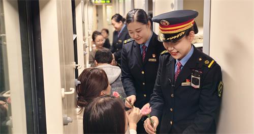 随后,各车厢乘务员分组行动,手持鲜花走进硬座、硬卧、软卧车厢,逐一向女性旅客送上鲜花与诚挚祝福,轻声送上“三八妇女节快乐,祝您旅途愉快”的问候,用贴心细致的举动,为旅客出行增添温馨仪式感。
