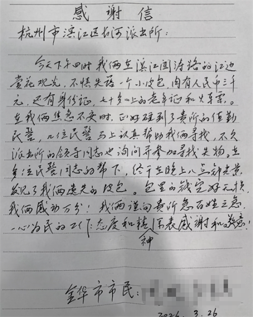 纸短情长,墨暖人心。3月27日,一封字迹工整、情真意切的手写感谢信被专程送到长河派出所,信中写道:“我俩谨向贵所急百姓之急,一心为民的工作态度和精神深表感谢和敬意”。字里行间满是两位老人的感激之情,也揭开了一个民警暖心助老寻回遗失皮包的温情故事。