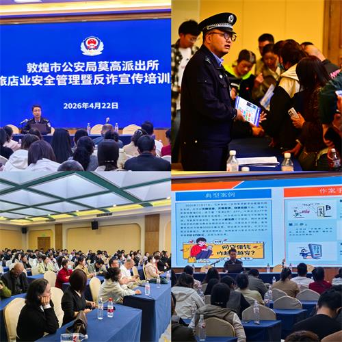 2026年4月22日,敦煌市公安局莫高派出所立足“匠心莫高”工作理念,组织开展旅店业安全管理暨反诈宣传专题培训,辖区近百家旅店经营者、前台工作人员齐聚课堂,以精细化培训筑牢文旅城市平安防线。