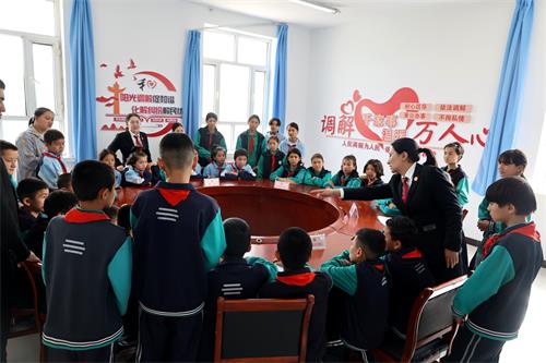 活动伊始,在法庭工作人员的带领下,师生们先后参观了诉讼服务中心、审判庭、调解室等场所。每到一处,工作人员都结合青少年认知特点,用通俗易懂的语言详细讲解相关功能区域的作用:在诉讼服务中心,介绍了立案窗口、便民服务台的工作流程,让同学们直观感受“一站式”司法便民服务的便捷高效;在审判庭,法官重点讲解了法徽、法槌、法袍的象征意义,细致解读了审判席、原告席、被告席的职能划分,现场模拟法庭礼仪,引导同学们感受法庭的庄严肃穆;在调解室,通过图文展板、案例讲解等形式,向师生们普及未成年人保护、预防校园欺凌等法律知识,让抽象的法律条文变得生动可感。整个参观过程中,同学们认真聆听、积极提问,工作人员耐心答疑,现场互动氛围热烈。