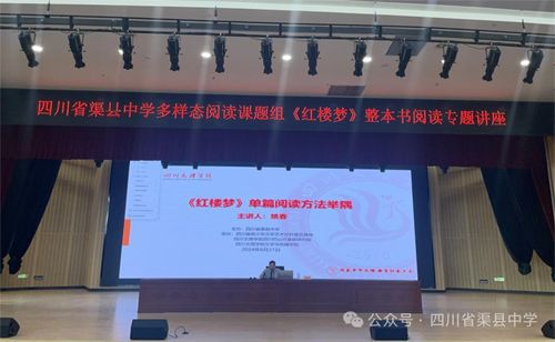 为顺应新高考改革趋势,促进文学艺术社科普及进校园、推动《红楼梦》整本书阅读教学研究,四川省青少年文学艺术社科普及进校园暨渠县中学多样态阅读课题组专题讲座于6月21日在渠县中学新校区图文馆隆重举行。四川省青少年文学艺术社科普及基地主任赵定贵、基地特聘专家张琪、基地专家姚春、渠县中学党委书记曹阳、副校长王松柏出席活动,渠县中学党委专职副书记汪震主持活动。活动中,曹阳、赵定贵分别致辞,张琪、姚春作《红楼梦》专题讲座,渠县中学近700名师生参加活动。