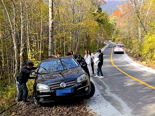 2025年10月2日下午,一名南方游客在哈尔滨市阿城区吊水壶景区游玩时,因沉醉于漫山红叶、不熟悉山路状况,驾驶的私家车发生侧滑,陷入路旁沟渠。幸好巡逻至此的松峰山派出所民警及时展开救援,并联动景区工作人员成功助其脱困,在秋意寒凉的山谷中上演了温暖人心的一幕。