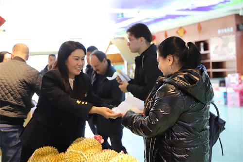 随后,代表团前往国际榴莲馆,现场了解泰国等国家进口榴莲的引进与销售情况,并品尝了特色榴莲。代表团提到,俄罗斯因纬度较高,仅部分地区有进口榴莲,而新发地国际榴莲馆的榴莲以独特风味和细腻口感获得了大家的一致认可。