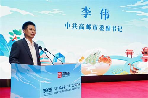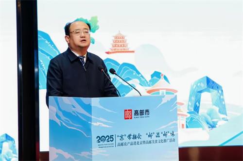 随后,北京新发地市场常务副总经理顾兆学登台致辞,他立足新发地“发展37年、占地3000多亩”的成熟市场底蕴,强调市场始终以“共同发展”为目标,以“市场需求”为导向,全力守护北京市民的“果盘子、米袋子、肉案子”。他提及新发地始终坚持“三产拉着一产走”,凭借“常年交易活跃、商户云集”的优势,已实现“立足北京、辐射全国、延伸全球”的布局,且过往推介会均秉持“靶向对接、精准对接”原则。顾兆学盛赞高邮农产品“质量上乘、历史文化厚重”,并以“来的都是客,相逢即是缘;朋友是资源,客户是财源;客商是天,客商是地,多则顶天立地;客商是风,客商是雨,众则呼风唤雨”的生动论述,寄语此次展会硕果累累,最后他郑重举杯,祝愿本次高邮农产品推介会圆满成功,期待两地以此次活动为起点,开启更长情、更深度的产业合作篇章。