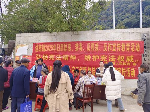 12月3日,进结镇人民政府组织司法所、平安法治中心、卫生院等部门联合开展宣传活动,进一步加强宪法宣传教育,共同感受宪法力量。在宣传活动中,工作人员向群众发放有关宪法、民法典、扫黑除恶、禁毒、反邪教、反电信诈骗、预防艾滋病等宣传资料,并提供法律咨询,为群众宣传习近平法治思想和关于宪法的重要论述,宣讲《宪法》、《民法典》及防范电信诈骗等法律知识。活动现场氛围浓厚,群众踊跃参加,工作人员热心发放宣传资料。本次宣传活动共计发放宣传资料300余份,悬挂标语3条,接受现场法律咨询10余人次,受教育300余人。