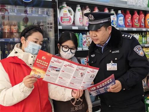 12月3日下午,民警与身着红马甲的社区干部手持宪法宣传折页,围绕宪法基本内容、公民权利义务等要点,向超市工作人员和购物群众进行讲解。现场,民警结合生活实例,解读了宪法与群众日常经营、消费维权的关联,社区干部则通过扫码互动的方式,引导大家参与线上宪法知识问答。
