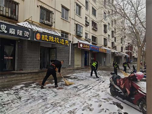 降雪过后,敦煌市沙州镇梨园社区西域路、三危路等路段积雪积冰,严重影响居民出行安全。社区执法中队以雪为令、闻雪而动,通过逐户上门通知的方式动员商户参与,牵头开展扫雪除冰行动,全力保障辖区道路畅通。