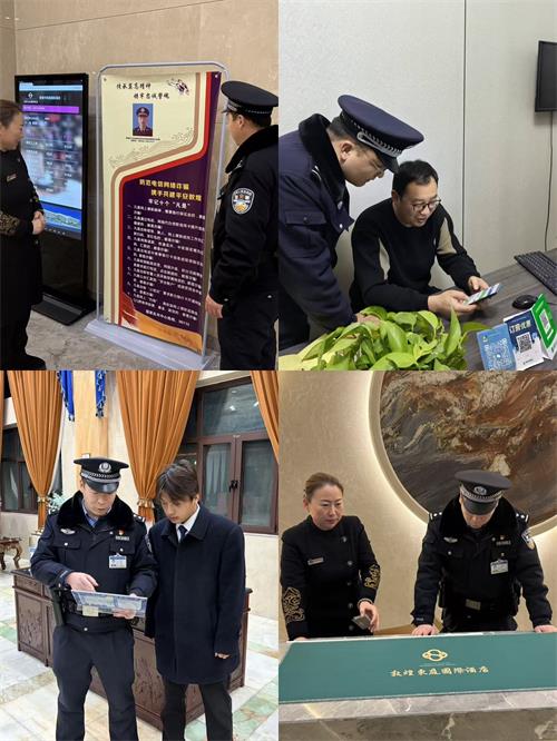 检查中,民警坚持“治安+消防”双管齐下,紧盯旅客入住“实名、实数、实情、实时”登记制度落实情况,细致核查身份信息录入是否规范、监控设备运行是否正常、监控覆盖范围是否全面;同步对消防设施器材配备、疏散通道畅通情况、应急照明及疏散指示标志设置等关键环节进行逐项排查。针对发现的灭火器压力不足、疏散通道堆放杂物等安全隐患,民警当场下达整改通知书,明确整改时限与标准,督促经营者立行立改、闭环管理。同时,民警结合典型案例,向酒店员工与入住旅客开展防盗防骗、消防安全知识宣传,叮嘱工作人员提高警惕,发现可疑情况第一时间上报,切实织密群防群治安全网。