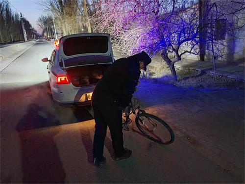 2026年1月7日19时许,莫高派出所民警巡逻至敦煌市莫高镇阳关东路火车站附近时,发现一位老人正费力地推着自行车在路边行走,步伐迟缓且身体摇晃,看起来十分虚弱。