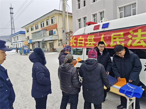 车身上“长白县人民法院普法宣传”的标语格外醒目,车外快速搭起简易咨询台,台面上不仅整齐摆放着《中华人民共和国民法典》、《民间借贷纠纷处理指引》等宣传手册,更陈列着纸抽、环保袋,还有村民常用的充电线等实用物资,刚一“亮相”就吸引了赶集群众纷纷驻足。让群众在使用中潜移默化学习法律知识,真正实现“学法在日常、用法在身边”。 普法宣传不止于“说”,更在于“做”。在为群众普法的间隙,法官干警们化身“矛盾排查员”,主动走进集市摊位、周边商铺,与摊主、商户、赶集群众拉家常、聊生计,细致询问是否存在邻里矛盾、债务纠纷、劳资争议等问题。遇到当场能化解的小纠纷,干警们现场组织调解,动之以情、晓之以理、明之以法,将矛盾化解在萌芽状态;对于较为复杂的问题,记录在册,留下联络卡,承诺后续跟进处理,切实减轻群众“跑远路、耗时间”的诉累。