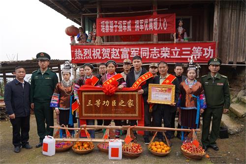岁末寒冬,年味渐浓。1月16日,武警北京总队、从江县人武部、县退役军人事务局联合非公有制经济组织拥军协会、乡镇干部、贵州省最美拥军人物赖志斌及村民代表,组成送喜队伍,穿行在从江县斗里镇山间小道,将立功喜报、奖励金与新春祝福,一同送到岑偶村现役军人赵富军家中。