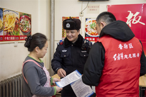 香坊分局民警与志愿者向辖区商户发放《致全市市民的一封信》