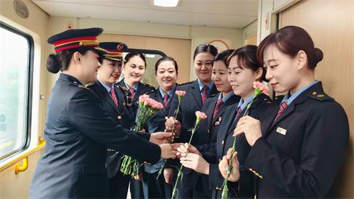 本次活动由列车员陈新精心策划筹备,她与列车长共同采购康乃馨等鲜花物资,为活动顺利开展做好保障。活动现场,列车长张宗玉、任娜代表班组,向坚守一线的女乘务员送上鲜花与节日问候,对大家立足岗位、辛勤奉献的精神致以敬意,勉励全体乘务人员以更饱满的热情、更严谨的态度做好客运服务工作,持续提升服务品质。