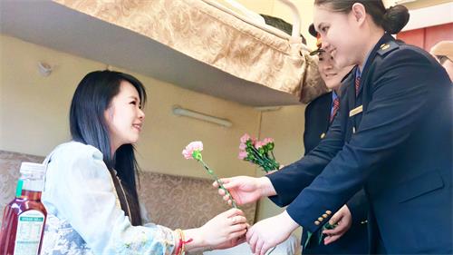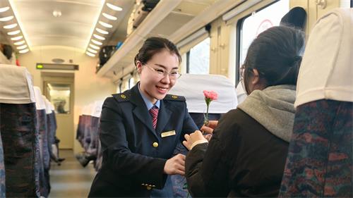 随后,各车厢乘务员分组行动,手持鲜花走进硬座、硬卧、软卧车厢,逐一向女性旅客送上鲜花与诚挚祝福,轻声送上“三八妇女节快乐,祝您旅途愉快”的问候,用贴心细致的举动,为旅客出行增添温馨仪式感。