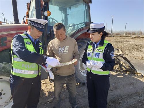 “老乡,驾驶三轮车一定要戴好安全头盔,春耕在忙,安全不能忘”针对春耕期间群众忙于农事、集中在田间的特点,宣传民辅警主动将交通安全知识送到“家门口”和“田埂上”。宣传人员利用农户劳作间隙,通过发放宣传资料、拉家常等方式,用通俗易懂的语言向群众普及交通安全知识。重点强调“骑乘摩托车、电动车必须佩戴安全头盔”“农用三轮车车厢严禁载人”“农机车辆上路要减速慢行”等注意事项,并通过讲解辖区发生的典型事故案例,以“身边事”教育“身边人”,让群众深刻认识到交通违法行为的危害性。
