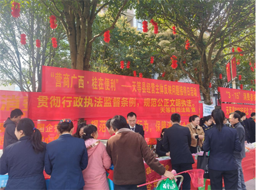为提升行政执法监督的社会知晓度和群众参与度,进一步规范行政执法行为,优化法治化营商环境,切实维护人民群众合法权益。近日,天等县司法局以“3•15”国际消费者权益日为契机,在天椒广场开展《行政执法监督条例》集中宣传。