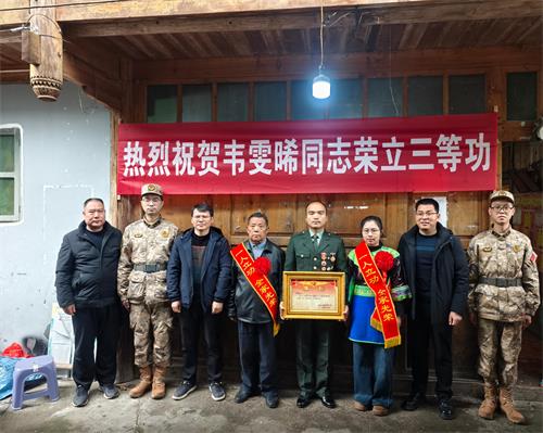 活动现场暖意浓厚,苗族同胞以隆重传统礼仪迎接喜报。身着绚丽盛装的村民载歌载舞,芦笙、锣鼓、鞭炮与欢呼声交织,响彻整个苗寨,尽显对人民子弟兵的崇敬。送喜报队伍高举“热烈祝贺韦雯晞同志荣立三等功”横幅,迈着整齐步伐,将三等功喜报郑重送到韦雯晞家属手中,并为其披上“一人立功 全家光荣”荣誉绶带,庄重的环节里,满是自豪与喜悦,彰显苗乡浓厚拥军情怀。