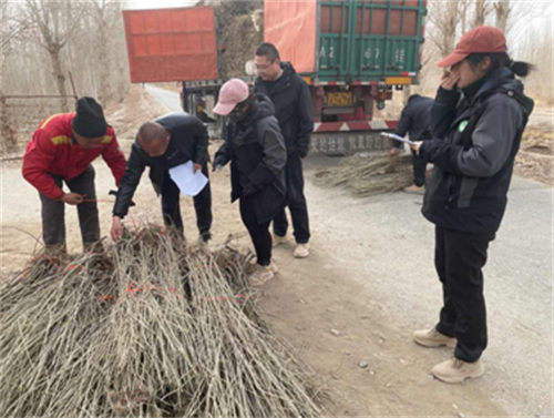 二、严把“苗木关”,源头管控确保质量。对调运的大果沙枣严格执行苗木“两证一签”与检疫检验制度,对苗高、地径、根系、有无病虫害等关键指标逐批次核验,坚决杜绝弱苗、病苗、不合格苗木进场。严格规范起苗、包装、运输、假植全流程,做到随起随运、随运随栽,最大限度降低苗木损耗,有效保障苗木活力质量。