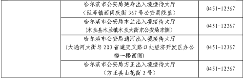 全市19个出入境接待大厅同步开启假期便民服务,保障群众护照、往来港澳台通行证申领、换补领等全项出入境业务办理需求。非办公时间遇出入境紧急情况,可拨打全国统一服务热线0451-12367求助。具体办公信息如下: