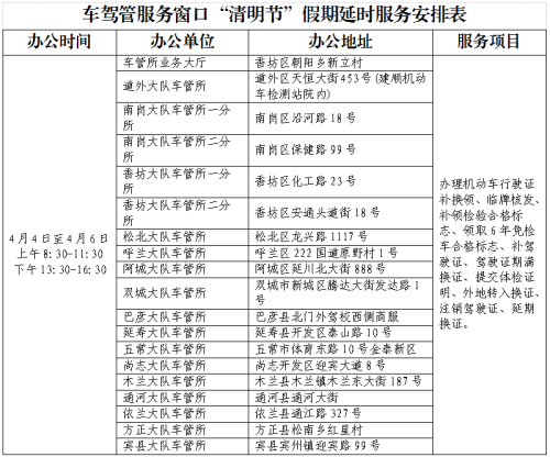 全市车驾管、交通违法处罚业务窗口同步推出假期延时服务,具体办公信息如下: